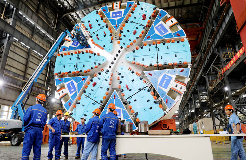 △2020年10月15日,工人在由隧道股份上海隧道工程有限公司自主研發(fā)制造的超大直徑盾構(gòu)機(jī)“騏躍”旁討論交流。