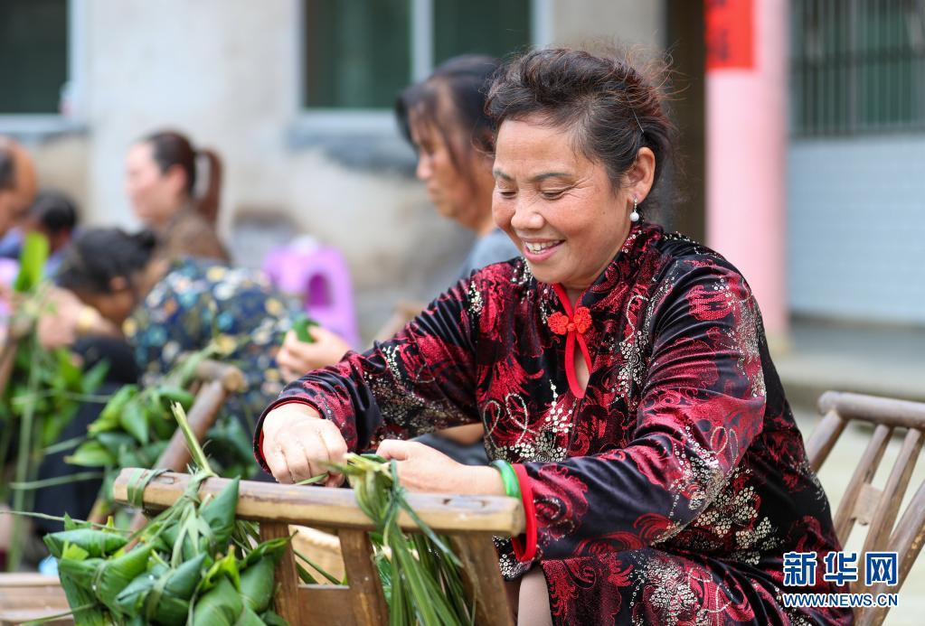 6月2日,貴州省銅仁市玉屏侗族自治縣亞魚鄉(xiāng)郭家灣村村民參加包粽子比賽。新華社發(fā)(胡攀學(xué)攝)