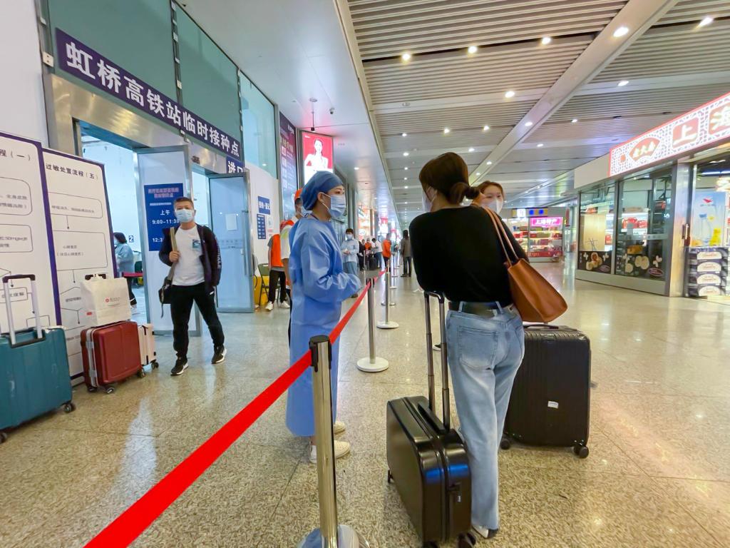 2021年5月29日,上海,旅客在上海虹橋火車站臨時(shí)疫苗接種點(diǎn)向醫(yī)務(wù)人員咨詢。新華社記者 黃安琪 攝