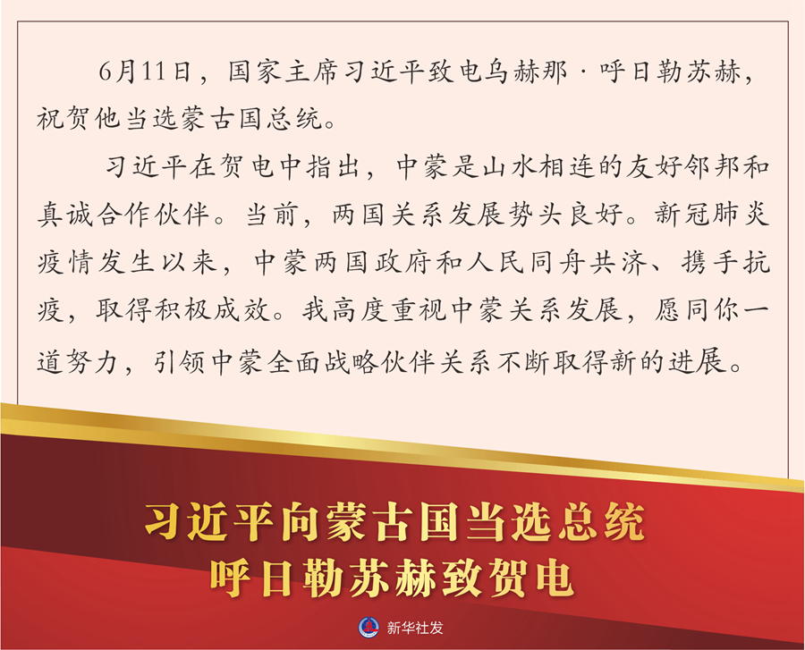 新華社北京6月11日電 6月11日,國(guó)家主席習(xí)近平致電烏赫那·呼日勒蘇赫,祝賀他當(dāng)選蒙古國(guó)總統(tǒng)。