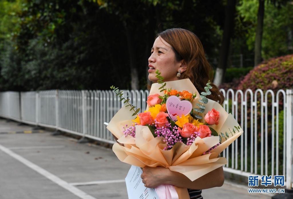 一位考生家長在給孩子送的花束賀卡上寫下