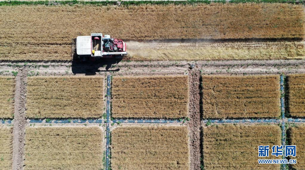 7月7日,在寧夏石嘴山市平羅縣頭閘鎮(zhèn)西永惠村,工作人員駕駛收割機收割小麥(無人機照片)。