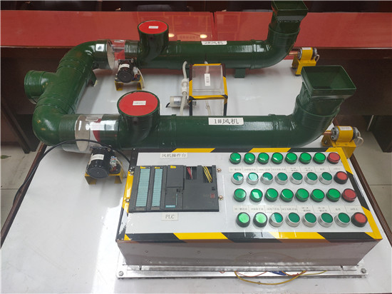 該模型由監(jiān)控系統(tǒng)和風機主體兩部分構成,監(jiān)控系統(tǒng)由PLC柜中的S7-300PLC模塊及電腦組成,風機主體利用PVC管材制作的風筒以及小電機組成。不僅可滿足實操培訓教學,同時還可進行模擬故障情況下的倒機操作,能有效提高主扇司機的操作技能,為公司礦井通風系統(tǒng)的安全穩(wěn)定運行多了一層保障。