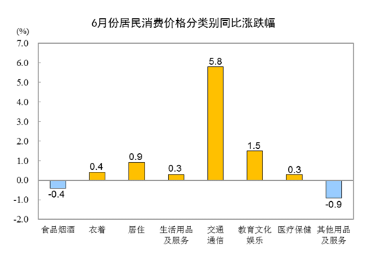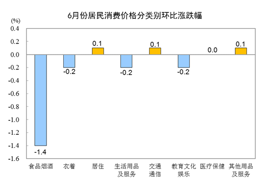 6月份,全國居民消費價格環(huán)比下降0.4%。其中,城市下降0.4%,農(nóng)村下降0.5%;食品價格下降2.2%,非食品價格持平;消費品價格下降0.6%,服務(wù)價格下降0.1%。