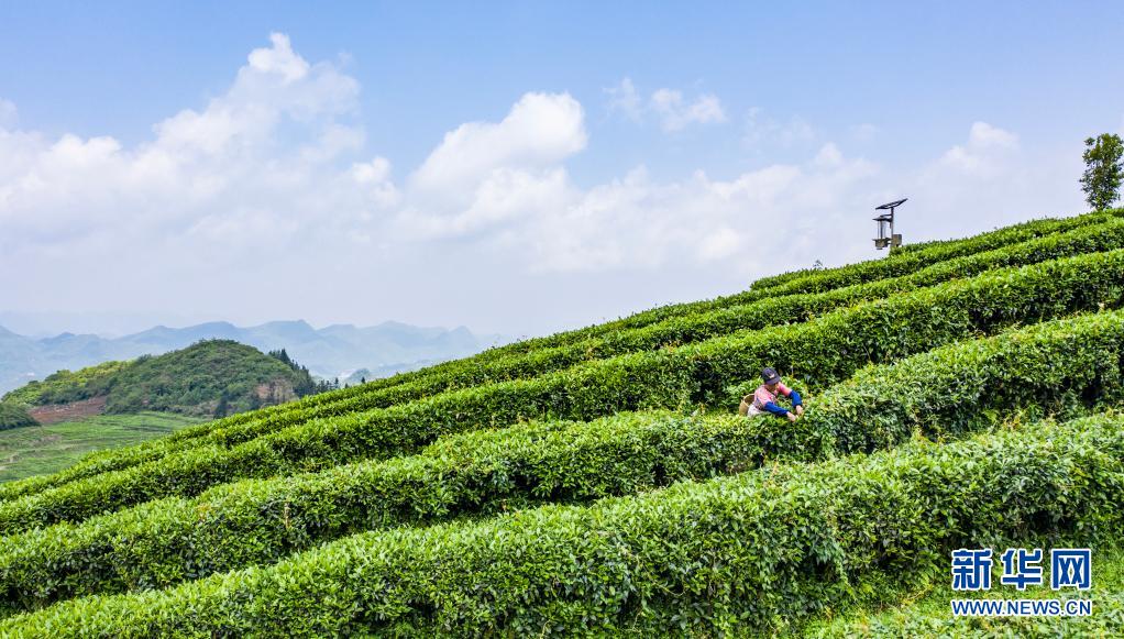 在貴州省六盤水市六枝特區(qū)落別鄉(xiāng),茶農(nóng)在采茶(4月20日攝,無人機(jī)照片)。新華社記者 陶亮 攝