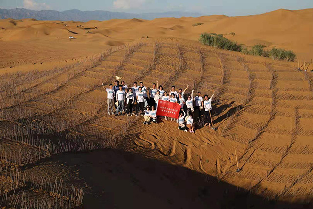 了解到這些后,他和同學立刻決定加入到這項工作當中,十個人一道,坐了一天一夜的綠皮火車,又經(jīng)過6小時的汽車顛簸,來到了大漠深處,通過制作麥草方格治理荒漠,沒想到這一去,在之后的每年夏天,他們還帶領了更多的志愿者來到這個地方。他們都有一個共同的信念——“直到風沙止步”。