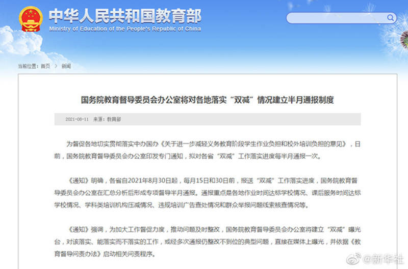 記者11日從教育部網(wǎng)站獲悉,國務(wù)院教育督導(dǎo)委員會辦公室日前印發(fā)專門通知,擬對各省“雙減”工作落實進度每半月通報一次。據(jù)悉,各省自2021年8月30日起,每月15日和30日前,報送“雙減”工作落實進度,國務(wù)院教育督導(dǎo)委員會辦公室在匯總分析后形成專項督導(dǎo)半月通報。通報重點是各地作業(yè)時間達標(biāo)學(xué)校情況、課后服務(wù)時間達標(biāo)學(xué)校情況、學(xué)科類培訓(xùn)機構(gòu)壓減情況、違規(guī)培訓(xùn)廣告查處情況和群眾舉報問題線索核查情況等。(記者王鵬)