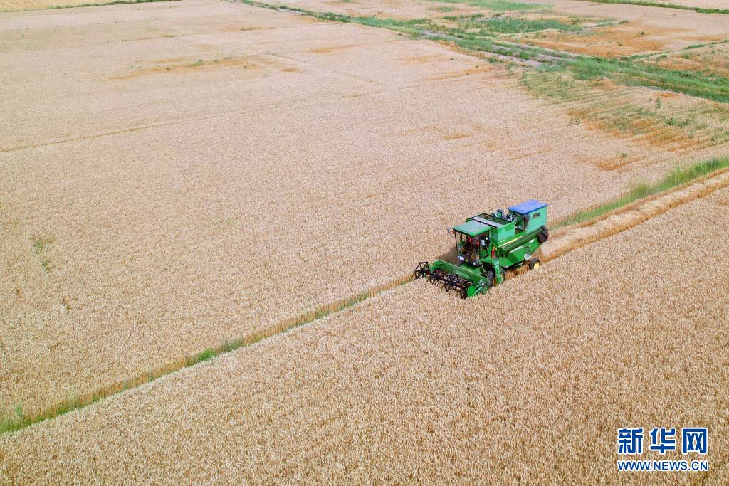 7月29日,在內(nèi)蒙古巴彥淖爾市臨河區(qū)小麥種植基地,收割機正收獲小麥(無人機照片)。新華社記者 李云平 攝