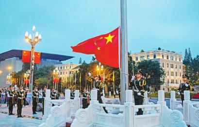 “向國旗——敬禮!”隨著國旗護(hù)衛(wèi)隊領(lǐng)隊發(fā)出響亮的口令,護(hù)旗隊員行舉槍禮。