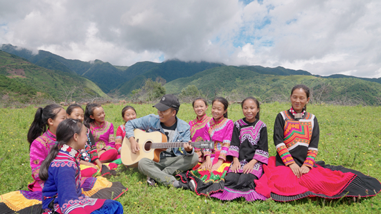 路面因?yàn)閯倓傁逻^(guò)的雨水變得有些泥濘,走了約半小時(shí)的山路后,鄉(xiāng)村教師吉布小龍帶著合唱團(tuán)的“妞妞們”坐在山頂草坪上。他用吉他伴奏,9個(gè)女孩圍著他放聲歌唱:“不懼密林深處的豺狼,敢于深海淺灘與蛇蝎作伴……”不遠(yuǎn)處的青山峰巒起伏,山頂上云霧徜徉。