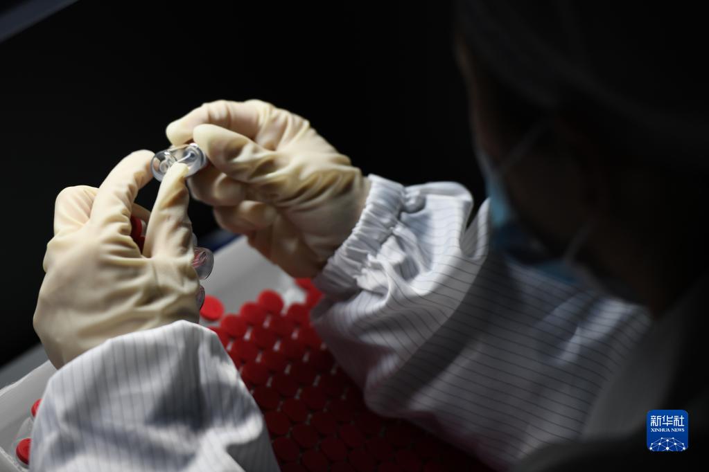 在安徽智飛龍科馬生物制藥有限公司新冠疫苗生產(chǎn)線上,工作人員對(duì)疫苗進(jìn)行人工檢測(cè)(5月20日攝)。新華社記者 黃博涵 攝