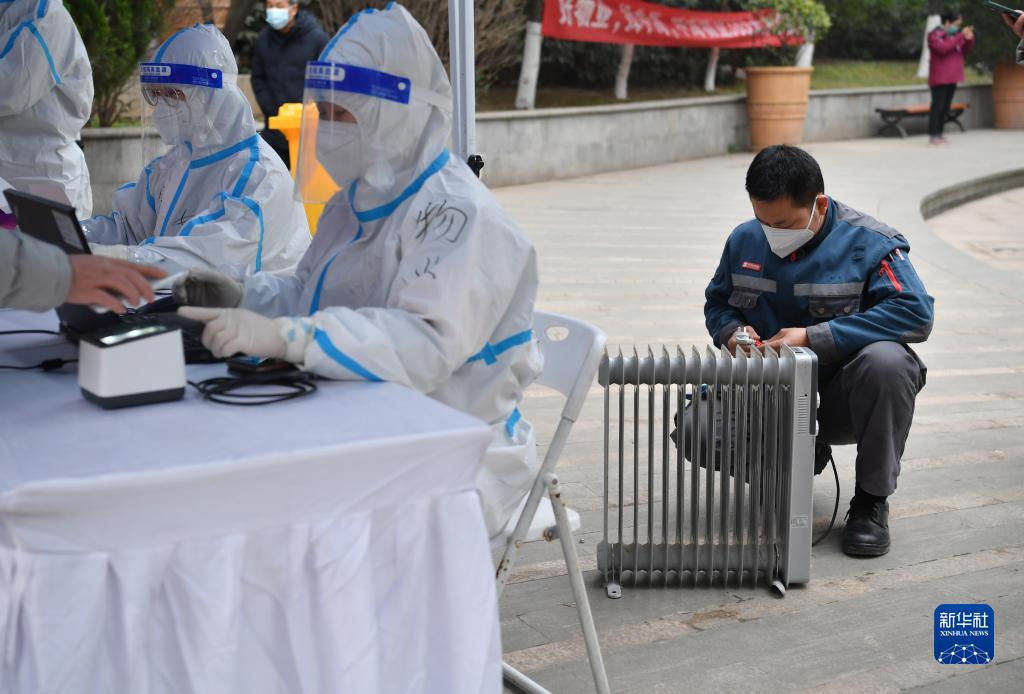 12月23日,在西安一小區(qū),核酸檢測(cè)點(diǎn)工作人員用電暖器取暖。新華社記者 邵瑞 攝