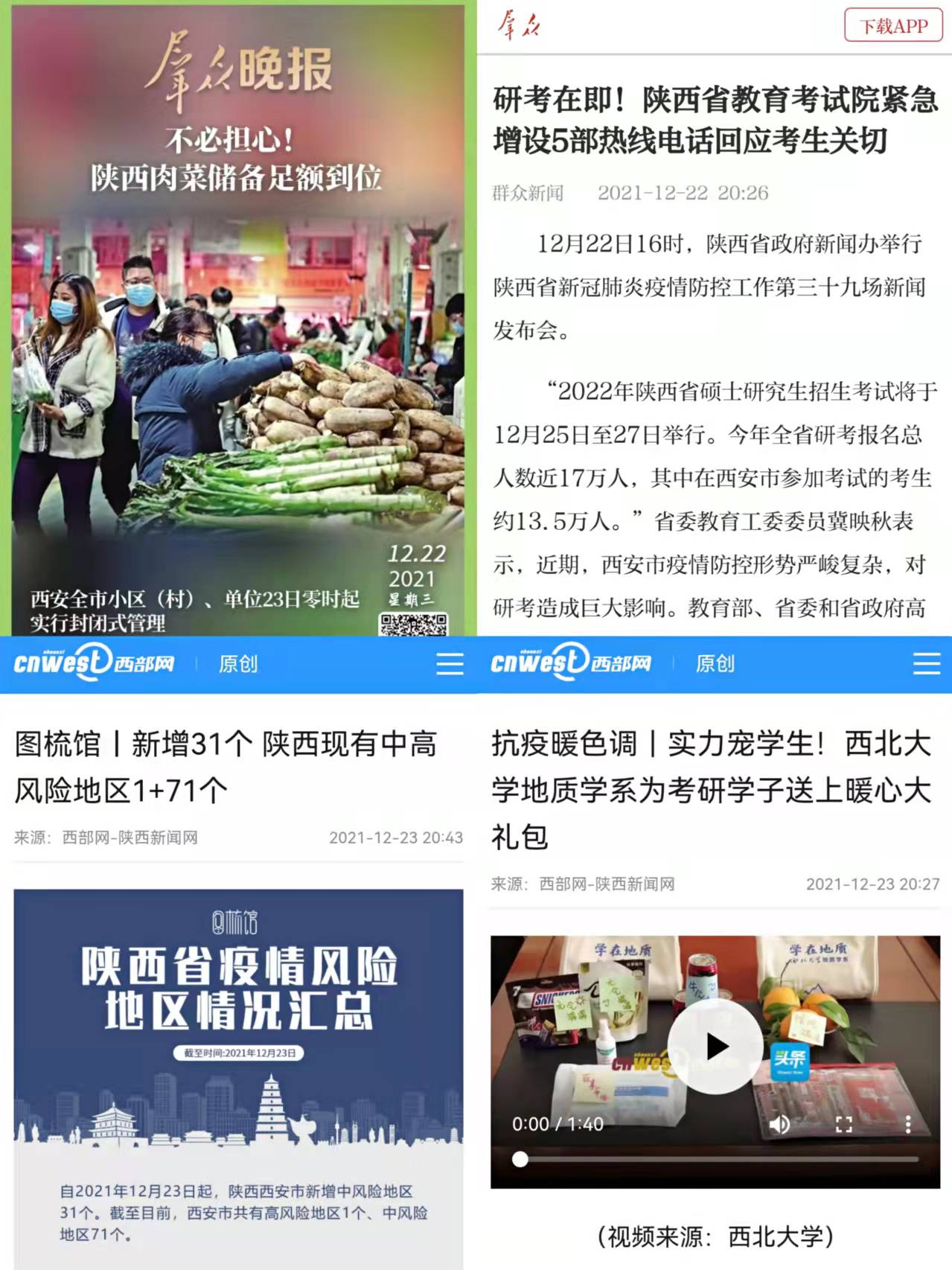 關(guān)注中小學(xué)停課不停學(xué)精彩不打折,發(fā)布忙碌在抗擊疫情一線(xiàn)的溫暖畫(huà)面,關(guān)切疫情之下的研究生考試……群眾新聞網(wǎng)、西部網(wǎng)、西安發(fā)布等省市重點(diǎn)網(wǎng)絡(luò)媒體也紛紛響應(yīng)倡議,深入一線(xiàn)挖掘戰(zhàn)疫身邊的真善美,用暖視頻、暖照片、暖文字驅(qū)散人民群眾在冬日里的寒冷與疫情中的陰霾。