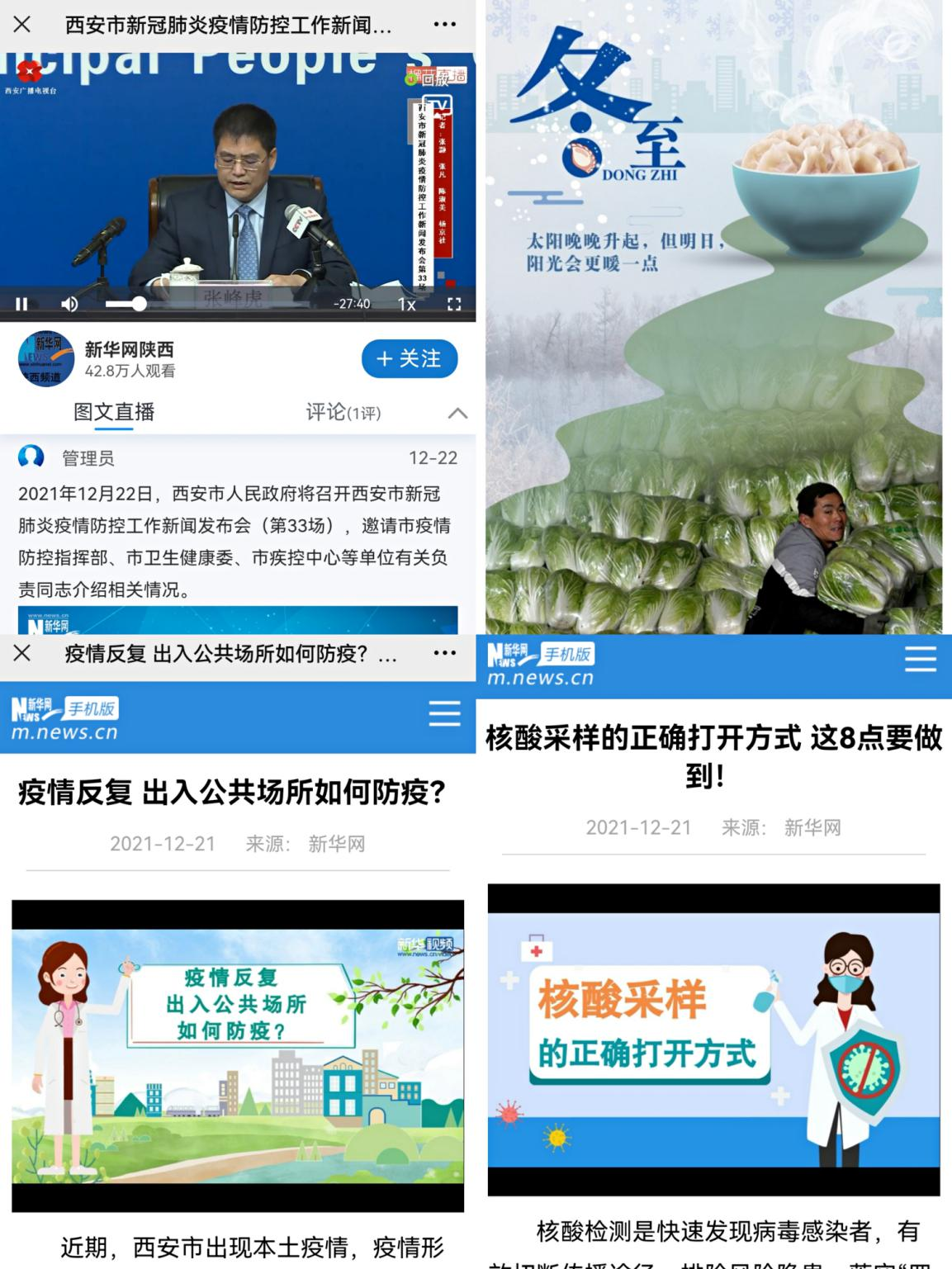 借助MG動(dòng)畫(huà)短視頻手段,新華網(wǎng)第一時(shí)間向網(wǎng)民提供出入公共場(chǎng)所如何防疫、核酸采樣的正確打開(kāi)方式等即時(shí)服務(wù)資訊;持續(xù)關(guān)注西安市新冠肺炎疫情防控工作,多平臺(tái)連續(xù)直播數(shù)場(chǎng)新聞發(fā)布會(huì),為網(wǎng)民提供全方位資訊服務(wù);冬至當(dāng)天,制作暖心海報(bào),冬已至,春可期,愿長(zhǎng)安常安!