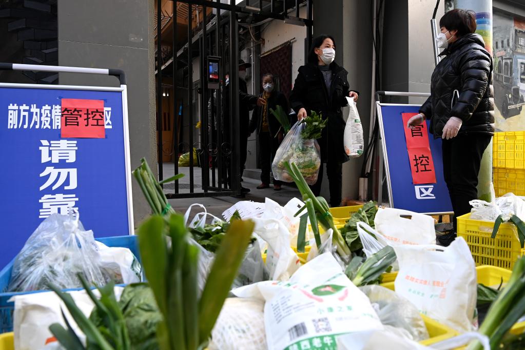 12月29日,在西安市新城區(qū)西一路街道通濟(jì)南坊一號(hào)院,居民在領(lǐng)取免費(fèi)生活物資。新華社記者 劉瀟 攝