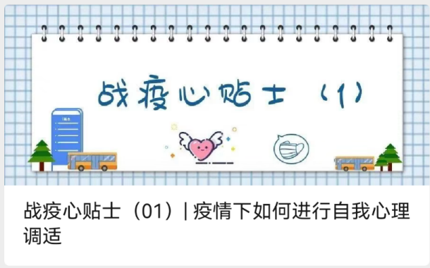 疫情防控期間,考慮到學(xué)生學(xué)習(xí)生活場(chǎng)所受限,學(xué)生情緒容易受到環(huán)境影響。心理健康教育中心通過(guò)新媒體開(kāi)展“戰(zhàn)疫心貼士”、心語(yǔ)FM專欄,每天為該校學(xué)生推送疫情心理調(diào)節(jié)小妙招及各類心理援助資源。相繼發(fā)布的15篇推文有效地幫助學(xué)生們掌握了有關(guān)疫情的心理健康知識(shí),學(xué)會(huì)了自我健心減壓,引導(dǎo)他們理性對(duì)待疫情,不恐慌、不信謠、不傳謠,保持良好心理狀態(tài)。