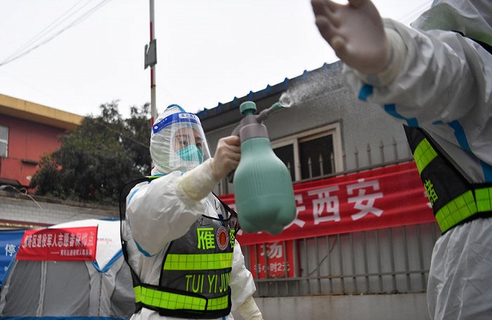 ↑1月7日,西安市雁塔區(qū)退役軍人志愿突擊隊(duì)隊(duì)員在一處核酸檢測(cè)點(diǎn)互相協(xié)助為防護(hù)服消毒。