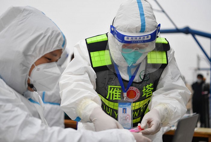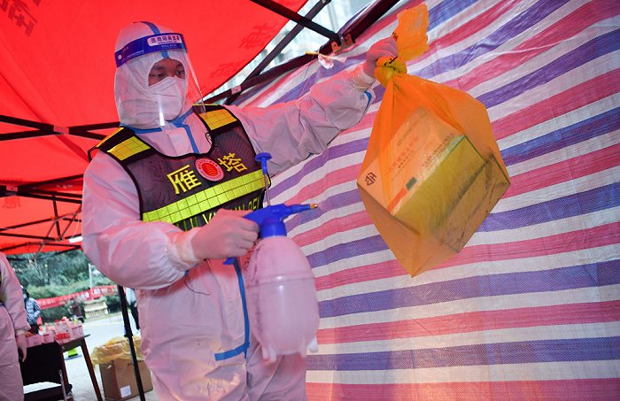 ↑1月7日,西安市雁塔區(qū)退役軍人志愿突擊隊(duì)隊(duì)員桑海鑫為核酸檢測(cè)樣本外包裝消毒。