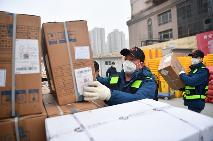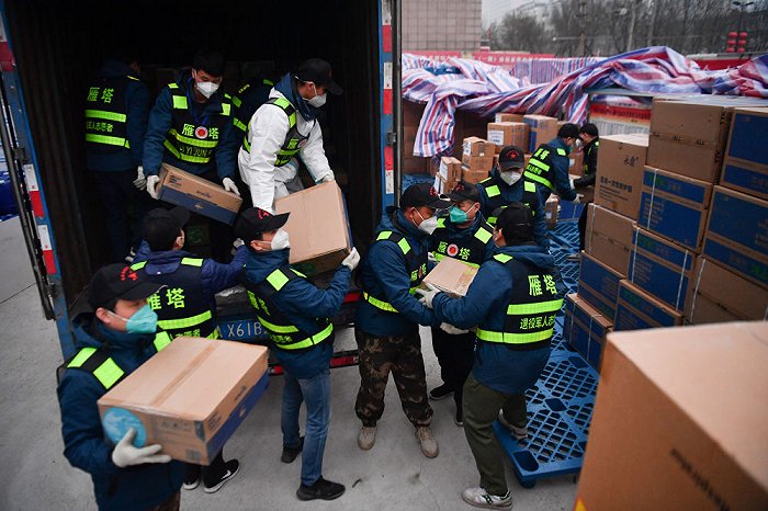 ↑1月6日,西安市雁塔區(qū)退役軍人志愿突擊隊(duì)隊(duì)員搬運(yùn)防疫物資。