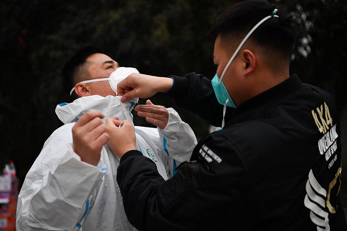 ↑1月7日,西安市雁塔區(qū)退役軍人志愿突擊隊(duì)隊(duì)員李龍(右)協(xié)助隊(duì)員吉存勝穿上防護(hù)服。