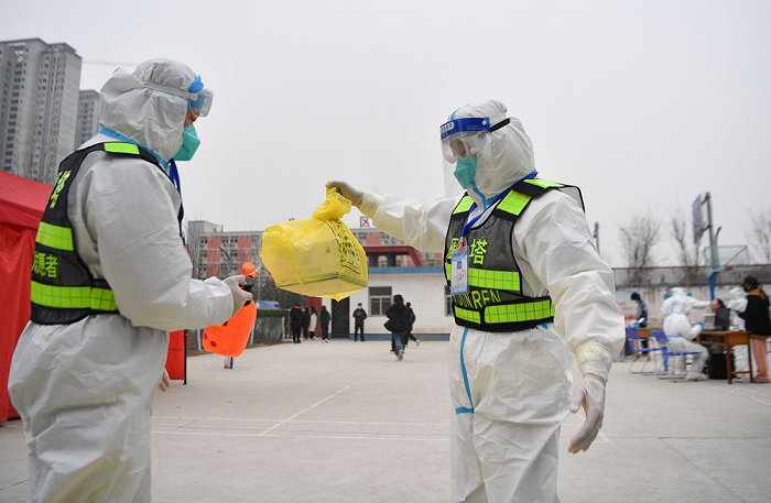 ↑1月7日,西安市雁塔區(qū)退役軍人志愿突擊隊(duì)隊(duì)員鄒浩東(右)在一處核酸檢測(cè)點(diǎn)與工作人員交接核酸檢測(cè)樣本。