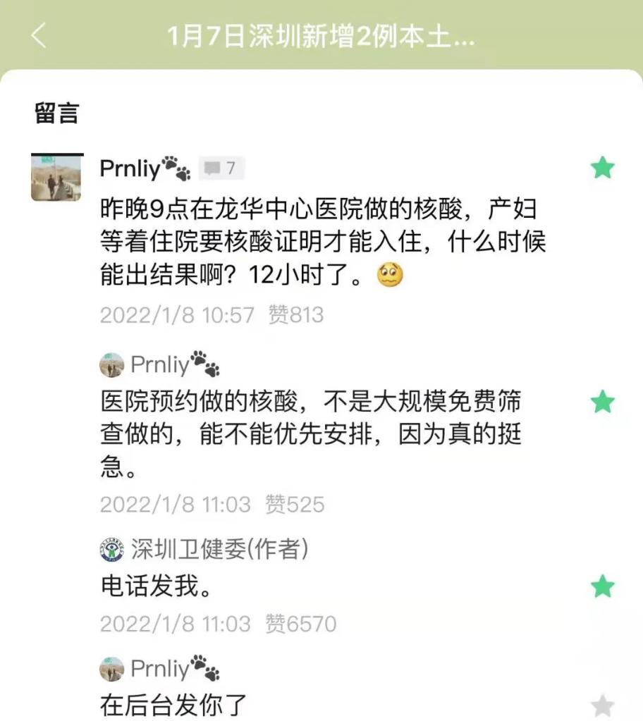 8日上午10時(shí)57分,在“深圳衛(wèi)健委”的微信公眾號(hào)推文下,一位叫“Prnliy”的網(wǎng)友留言,引起深圳市衛(wèi)健委工作人員的關(guān)注。這位網(wǎng)友說(shuō):“昨晚9點(diǎn)在龍華中心醫(yī)院做的核酸,產(chǎn)婦等著住院要核酸證明才能入住,什么時(shí)候能出結(jié)果???12個(gè)小時(shí)了。”