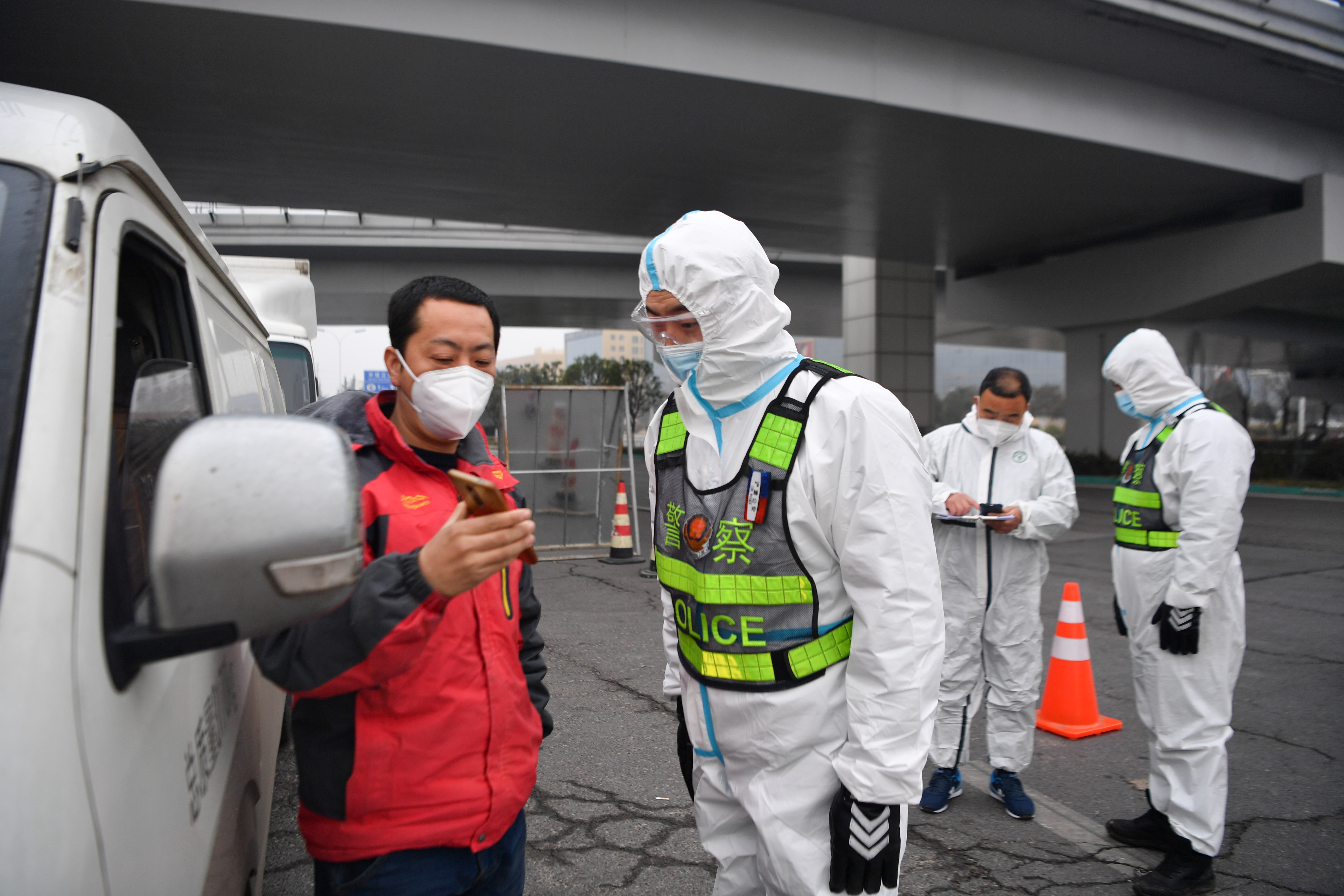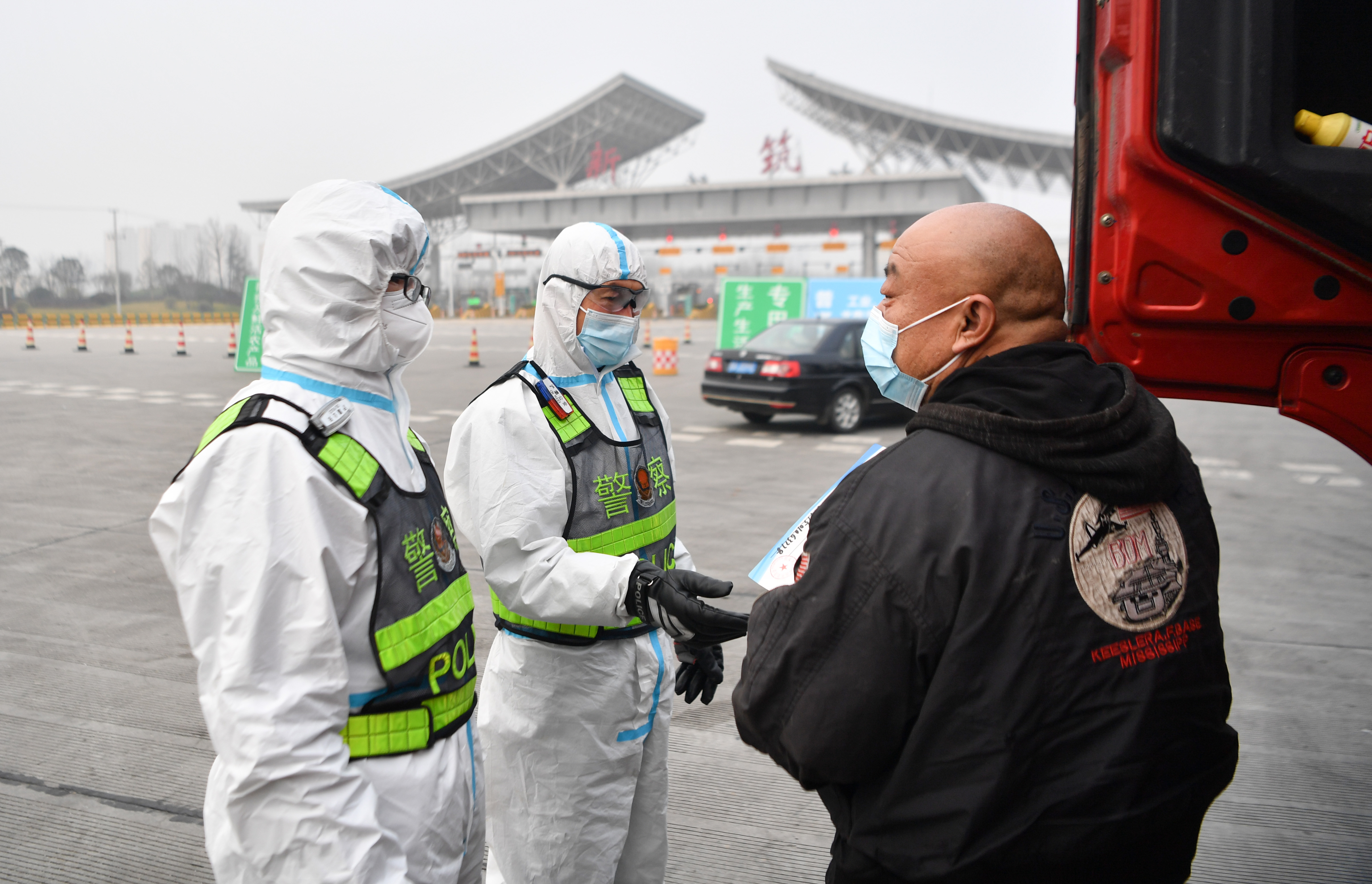 1月10日,西安市公安局浐灞生態(tài)區(qū)分局民警在西安市繞城高速新筑收費(fèi)站查驗駕駛員健康碼。新華社記者 張博文 攝