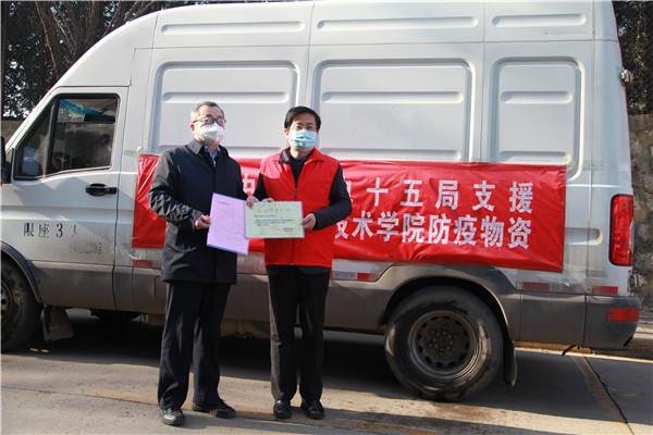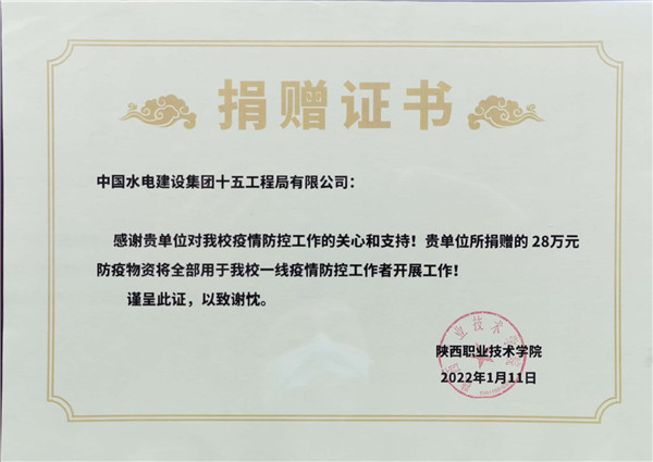 1月11日下午15:00,在陜西職業(yè)技術(shù)學(xué)院舉行簡短捐贈儀式,陜西職業(yè)技術(shù)學(xué)院黨委副書記、院長劉勝輝,黨委副書記、紀(jì)委書記何軍,副院長王慶等參加了捐贈儀式。劉勝輝代表學(xué)院黨委向我公司表示感謝,他表示,在疫情防控的關(guān)鍵時刻,水電十五局一周內(nèi)2批次送來價值近28萬元生活物資,及時緩解更極大充實(shí)和豐富了我校抗疫生活物資,為我院師生樹立了光輝榜樣,堅(jiān)定了共克時艱的信心和決心。何軍向公司黨委副書記、紀(jì)委書記、工會主席任志宏贈送了捐款證明和感謝信。任志宏表示,水電十五局作為駐陜央企,一直以來,堅(jiān)決貫徹落實(shí)黨中央決策部署,主動響應(yīng)陜西省委組織部和省國資委號召,面對此次疫情,將積極踐行央企擔(dān)當(dāng),履行社會責(zé)任,用實(shí)際行動為西安高校疫情防控貢獻(xiàn)一份力量!