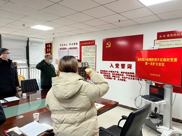 2022年1月6日,商貿(mào)園辦疫情防控片區(qū)臨時黨委在第一次擴大會議上重溫入黨誓詞。浐灞融媒體中心供圖