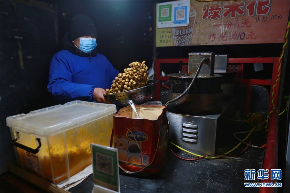 1月25日,在西安市未央?yún)^(qū)一家爆米花攤位,老板正在制作爆米花。新華網(wǎng) 王智超 攝