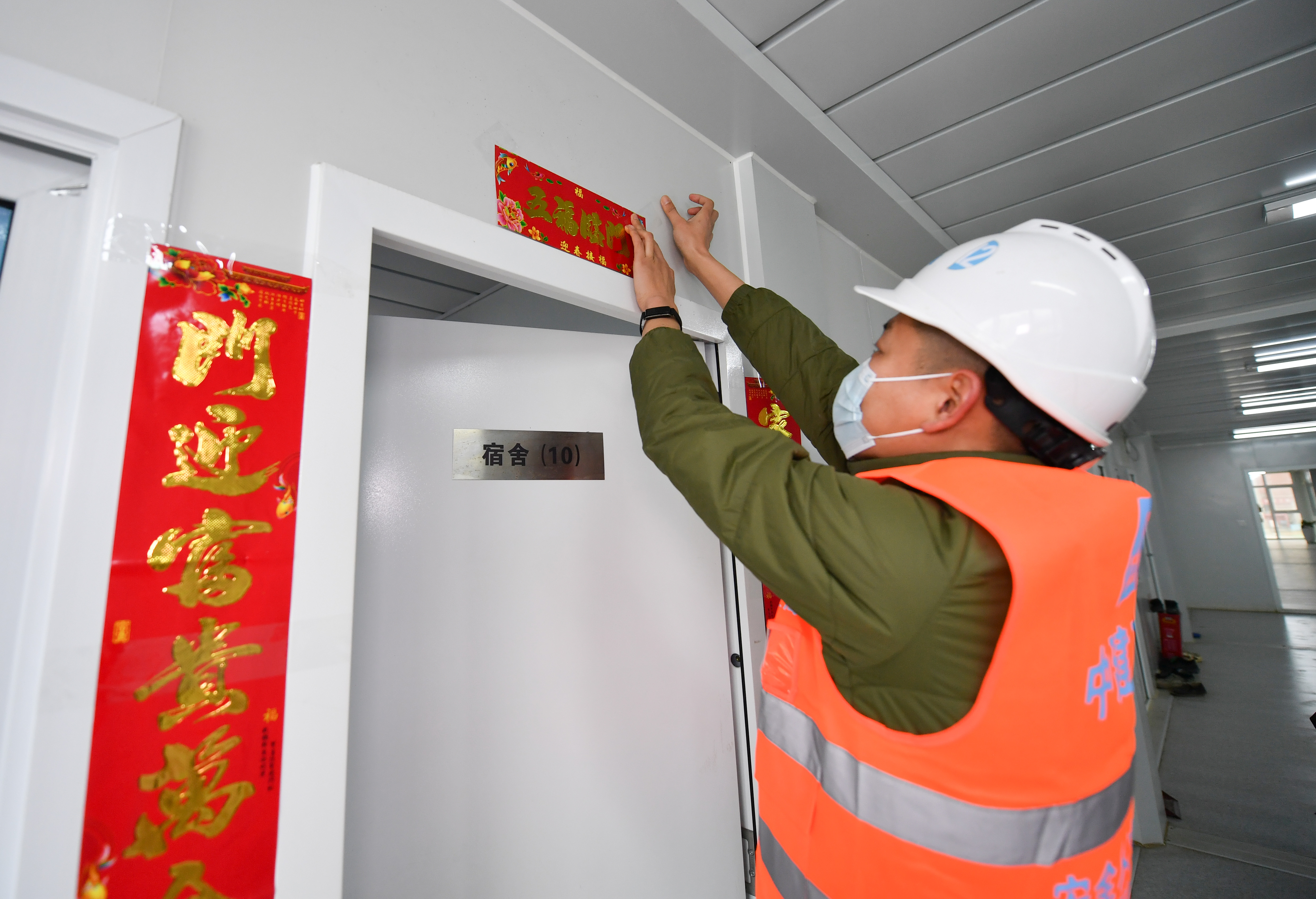 1月30日,在西安市第一實驗學校建設項目工地,一名留守工地的項目管理人員為宿舍貼上春聯(lián)。新華社記者 張博文 攝