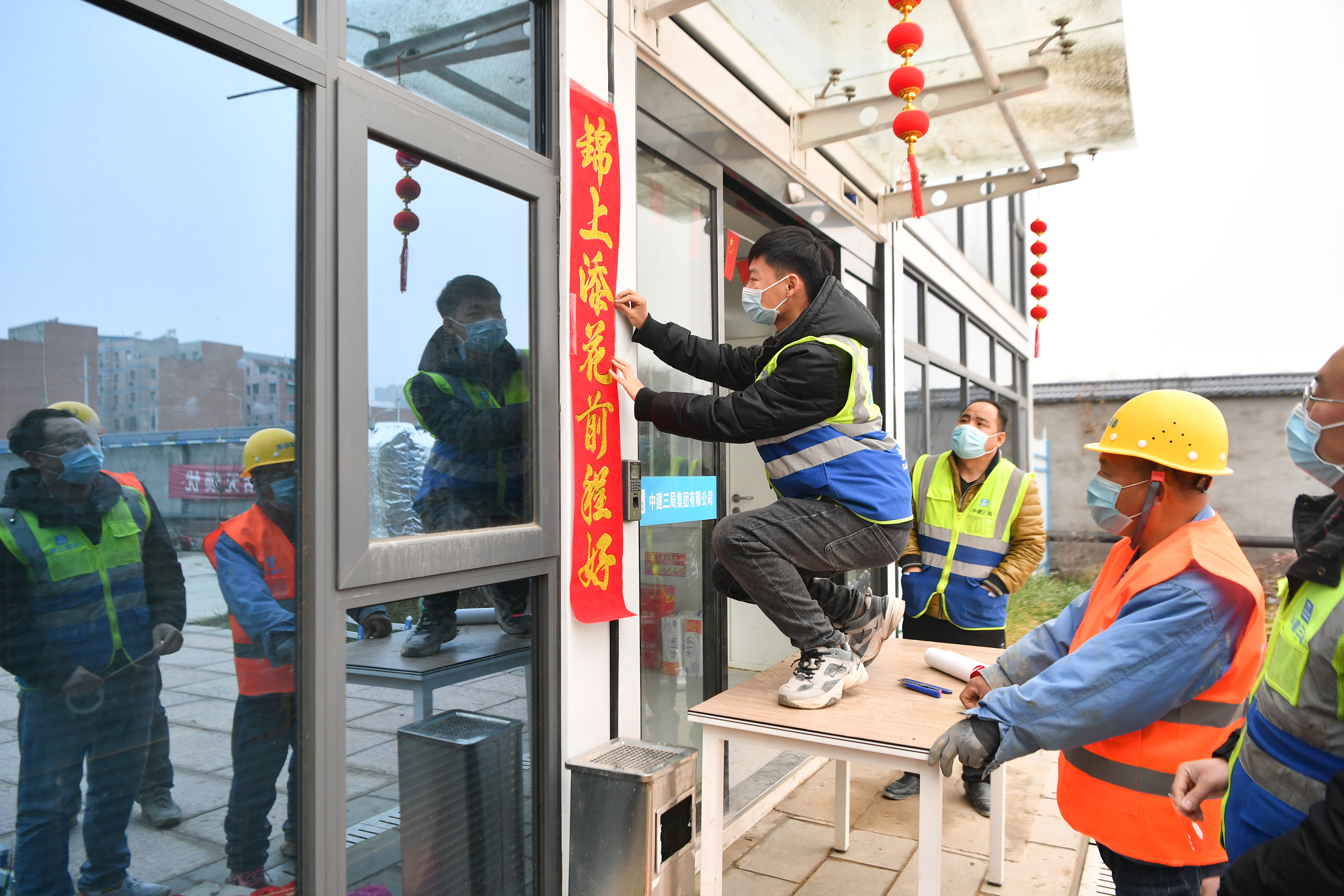 當日是農(nóng)歷臘月二十八,在陜西省西安市第一實驗學校建設項目工地,留守工地的建設者用貼春聯(lián)、掛燈籠等方式,迎接佳節(jié)的到來。