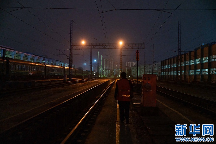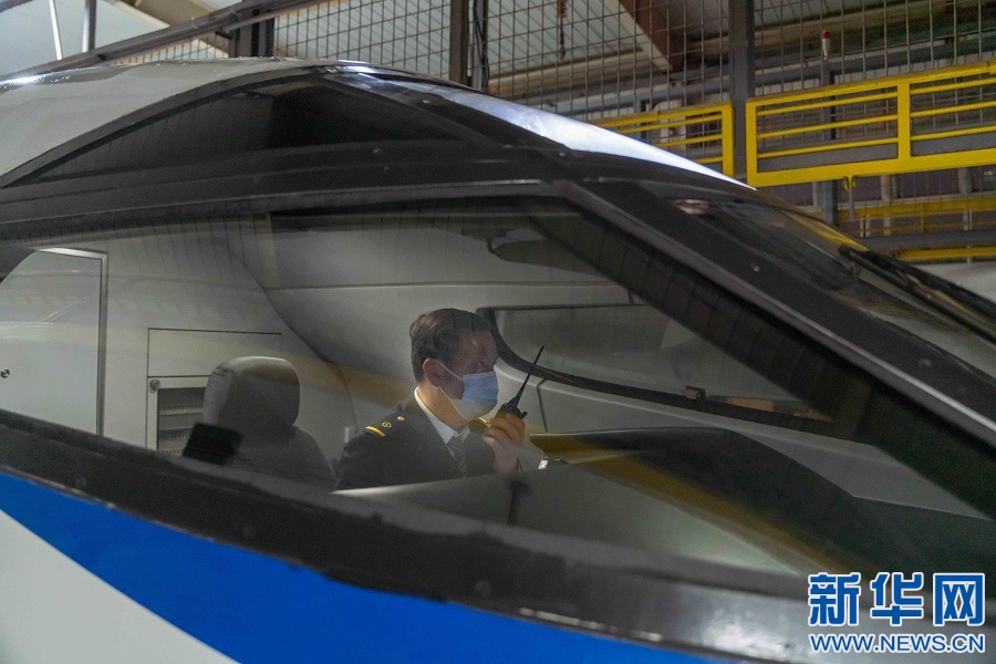 檢查完動車組,蘇盛行走在列車停車場內(nèi)。新華網(wǎng)發(fā) 趙磊 攝
