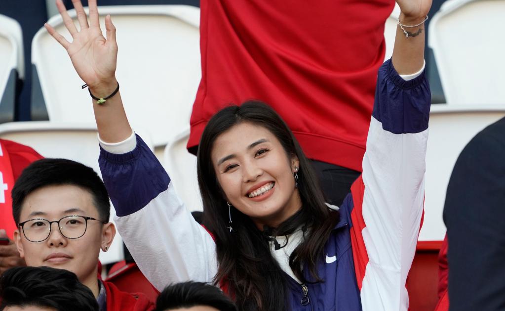2019年6月13日,中國(guó)女足守門(mén)員趙麗娜在看臺(tái)上加油助威。新華社記者丁旭攝