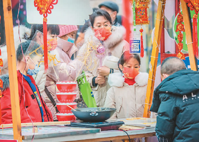 2021年,湖北省經(jīng)濟(jì)增速領(lǐng)跑全國(guó),成績(jī)亮眼。圖為春節(jié)期間,游客在武漢武昌楚河漢街觀看糖畫。趙廣亮攝(人民視覺(jué))