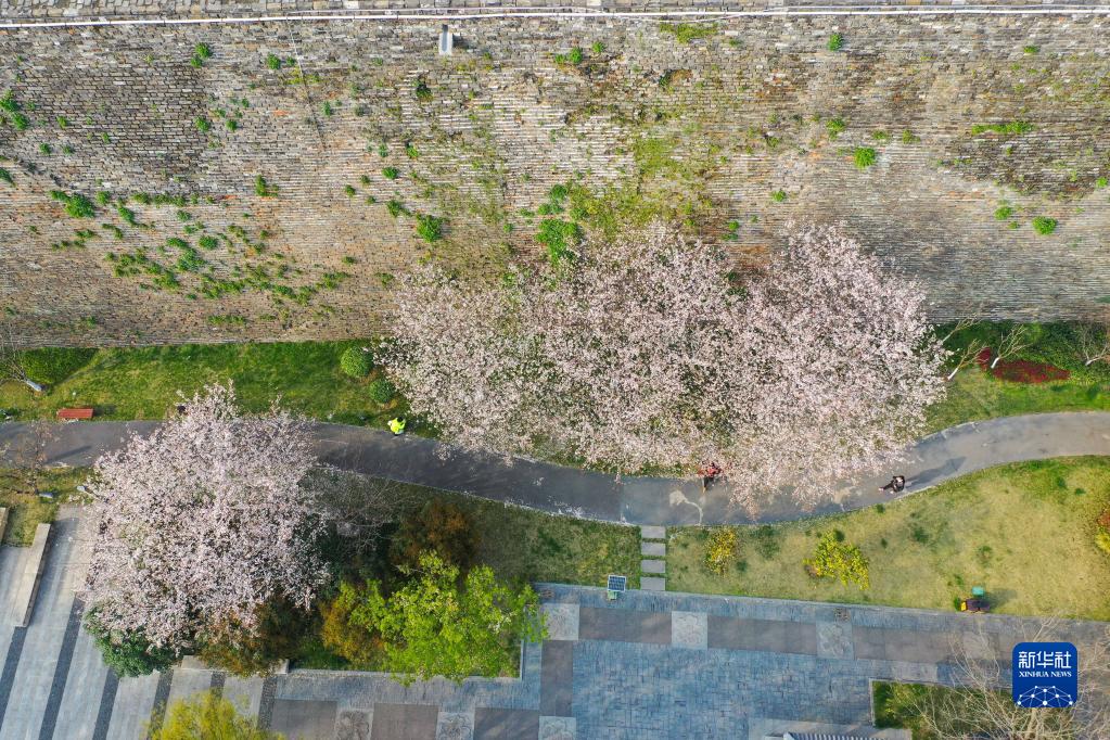 3月23日,游人在南京明城墻腳下游玩(無人機(jī)照片)。新華社記者 季春鵬 攝