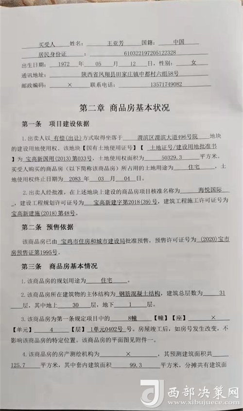 決策熱線|寶雞市民王女士(化名):我于2021年3月在寶雞市高新區(qū)渭濱大道臻和天下看了一套住宅樓,覺得地段位置也好。經(jīng)過和家人一起商議,與售樓人員確定了8幢1單元4層?xùn)|戶南北通透的房子,于2021年3月18日簽訂書面商品房買賣合同,于2021年4月15日簽訂按揭貸款合同給開發(fā)商交清了房款,前期共花費(fèi)七十余萬。