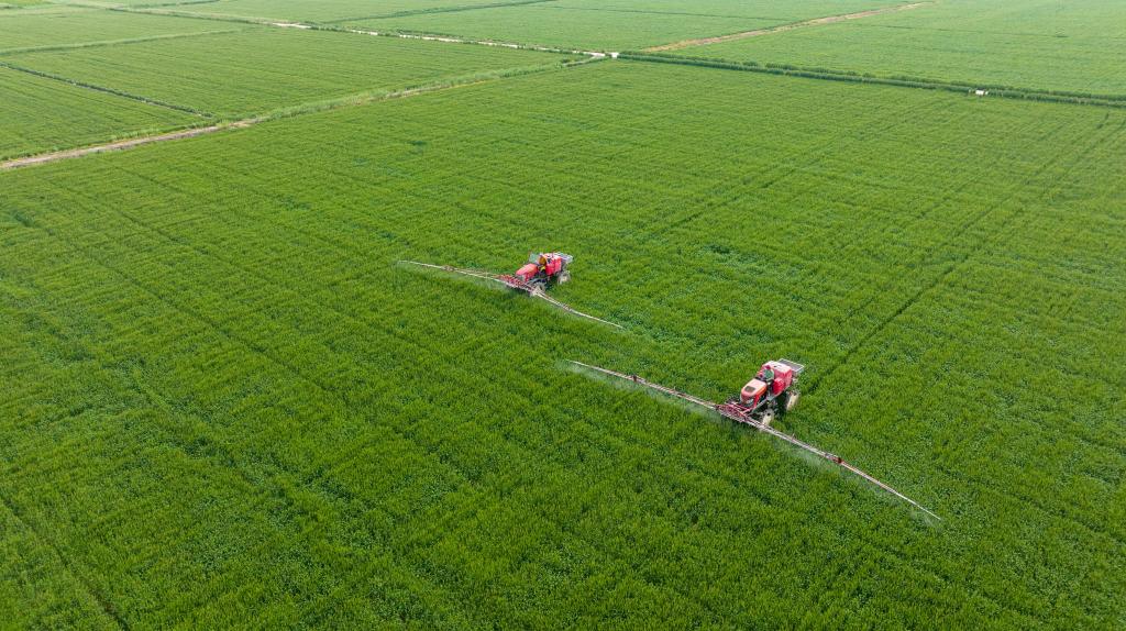 2022年4月20日,江蘇省海安市孫莊街道夏岔村一種植基地,村民駕駛植保機(jī)械在小麥田間作業(yè)(無人機(jī)照片)。新華社發(fā)(翟慧勇攝)