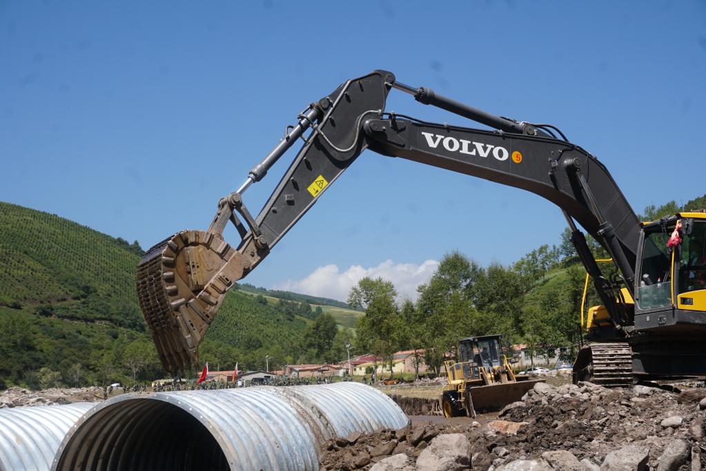8月20日,在青海省西寧市大通回族土族自治縣青山鄉(xiāng)沙岱村,挖掘機準備將一截波紋管涵放置到河道上。(新華社記者周盛盛 攝)