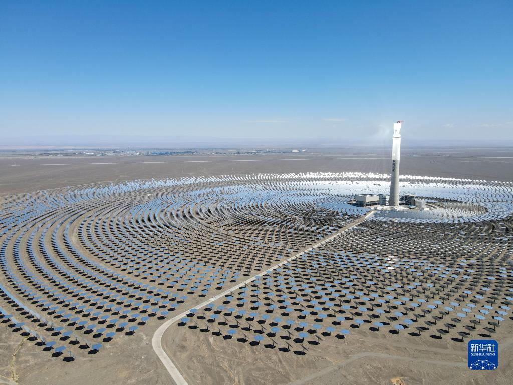 在新疆伊吾縣淖毛湖鎮(zhèn)拍攝的哈密50兆瓦熔鹽塔式光熱發(fā)電站(2021年8月22日攝,無人機照片)。作為新疆第一座光熱發(fā)電站,哈密50兆瓦熔鹽塔式光熱發(fā)電站不僅污染物零排放,還通過儲存熱能實現(xiàn)24小時持續(xù)發(fā)電。新華社記者 高晗 攝