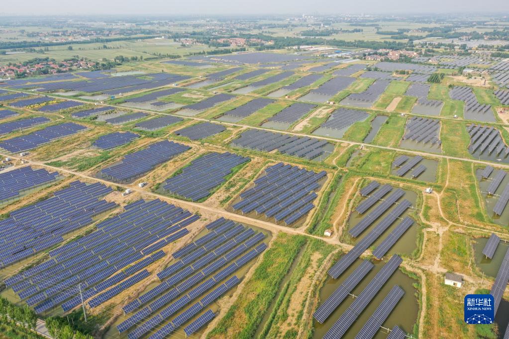 山東高青縣湖東村周邊建設的千余畝漁光互補養(yǎng)殖場(2022年5月24日攝,無人機照片)。新華社記者 朱崢 攝