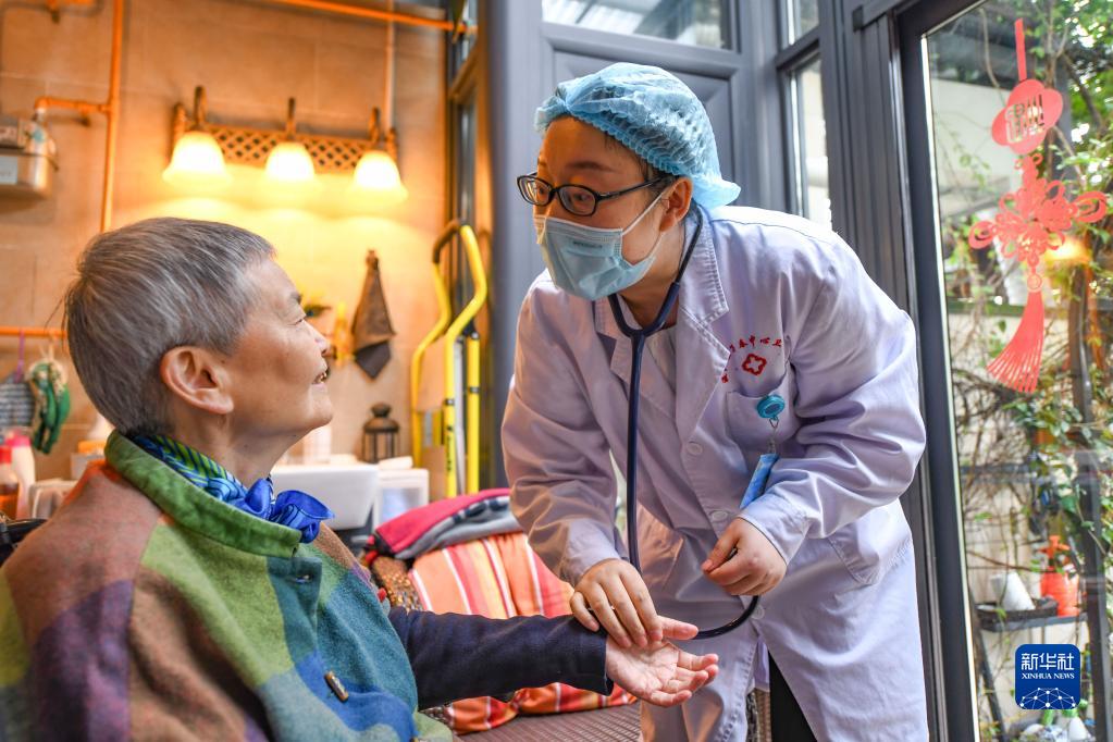 在四川省成都市溫江區(qū)萬春鎮(zhèn)天鄉(xiāng)路社區(qū)居民家中,家庭醫(yī)生楊靜(右)在詢問居民葉茂群近期的身體情況(2022年5月18日攝)。新華社記者 王曦 攝