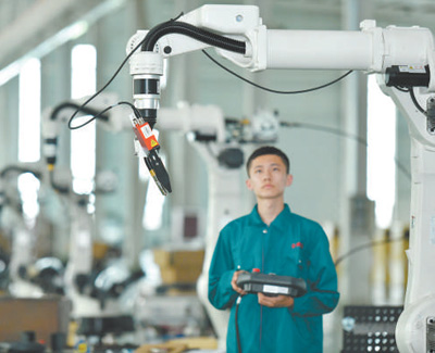 河北省任丘市通過(guò)搭建科技創(chuàng)新平臺(tái),建設(shè)研發(fā)中心、技術(shù)研究院,持續(xù)深化產(chǎn)學(xué)研合作交流,推動(dòng)企業(yè)轉(zhuǎn)型升級(jí)。圖為工作人員在生產(chǎn)車間調(diào)試機(jī)器人。 |