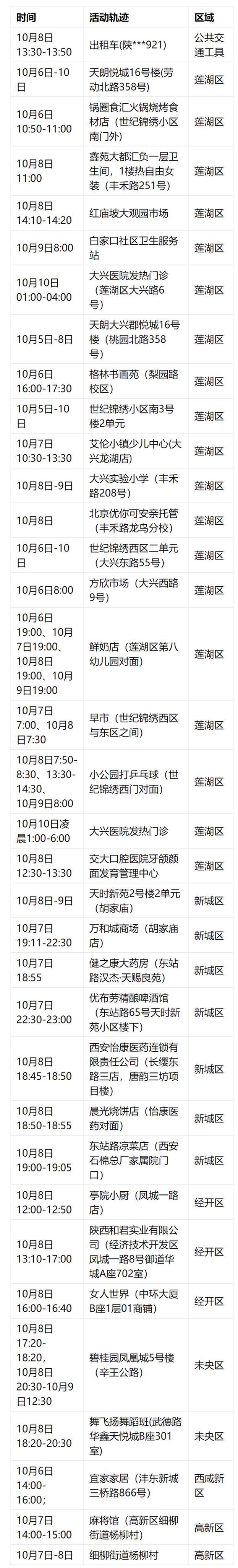 10月10日0-24時,西安市新增11例本土感染者(4例確診病例,7例無癥狀感染者),其中4例為省外來陜返陜?nèi)藛T,7例為已診斷病例的密切接觸者;2例主動報備后在卡口即管控,6例在集中隔離中發(fā)現(xiàn),3例在主動就醫(yī)時發(fā)現(xiàn)。經(jīng)初步流調(diào),病例在隔離管控前涉及到的活動軌跡為: