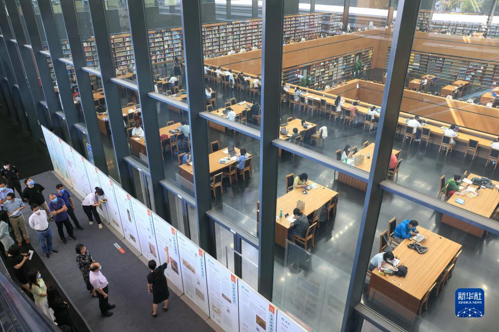 在北京國家圖書館,工作人員介紹“經(jīng)典,予生活以詩意——‘文津經(jīng)典誦讀’十周年主題展”(2022年9月7日攝)。新華社記者 殷剛 攝