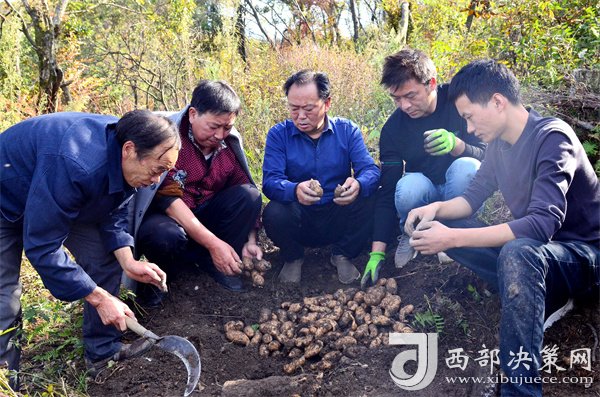 10月18日,寧強(qiáng)縣陽(yáng)平關(guān)鎮(zhèn)伍家壩村第一書記唐賢斌(右三)正在天麻基地查看天麻的收成等情況。