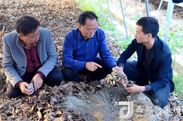 10月18日,伍家壩村第一書記唐賢斌(中)正在天麻繁育基地查看零代天麻種子生長(zhǎng)情況。
