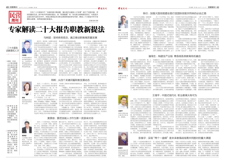 【《中國新聞》報記者 劉軍 報道】中共二十大報告對于“實施科教興國戰(zhàn)略,強化現(xiàn)代化建設人才支撐”進行了詳細豐富、深刻完整的論述,其中有許多創(chuàng)新的提法,如“職普融通”和“優(yōu)化職業(yè)教育類型定位”均是首次出現(xiàn)在黨代會的文件中。本報記者就此采訪職業(yè)教育領域的多位專家,解讀二十大報告中關于發(fā)展職業(yè)教育、培養(yǎng)高技能的新提法。