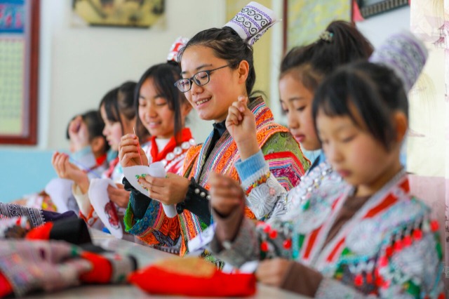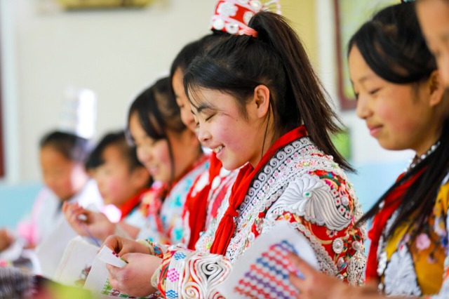 近年來,貴州省黔西市新仁苗族鄉(xiāng)折溪小學積極推動優(yōu)秀非遺文化進課堂,選任學校精通刺繡、蠟畫、蠟染的教師指導學生學習,讓苗族孩子們“零距離”接觸非遺技藝,弘揚和傳承民族優(yōu)秀傳統(tǒng)文化。中國教育報-中國教育新聞網(wǎng)通訊員 周訓超 攝