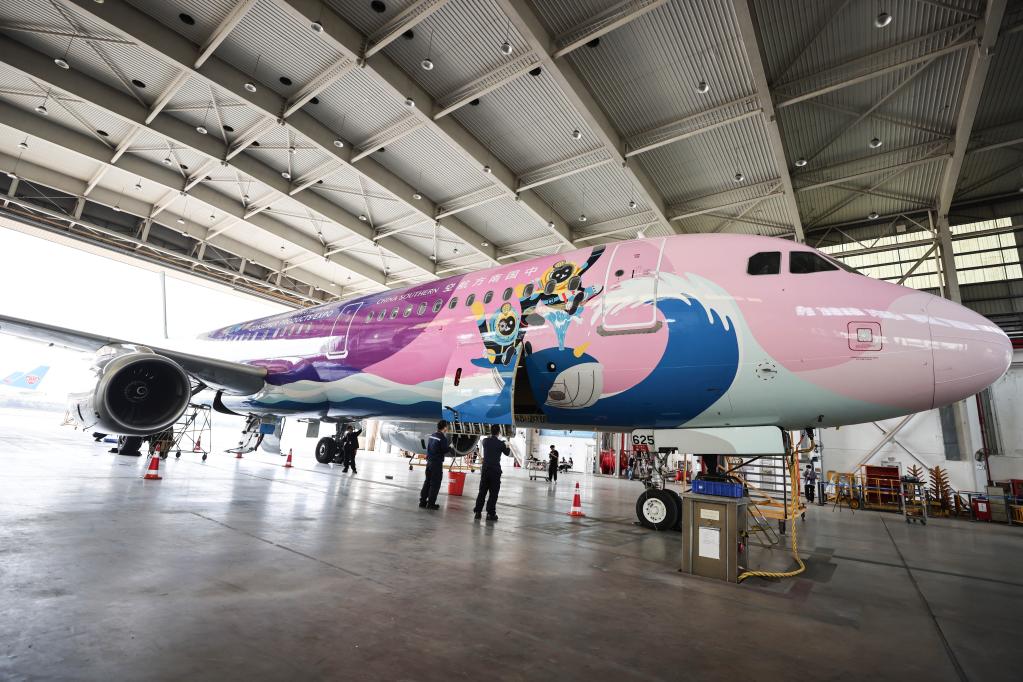 2023年3月7日,在??诿捞m國際機(jī)場,南航機(jī)務(wù)人員對(duì)“消博號(hào)”彩繪飛機(jī)進(jìn)行深度檢查。新華社記者 張麗蕓 攝